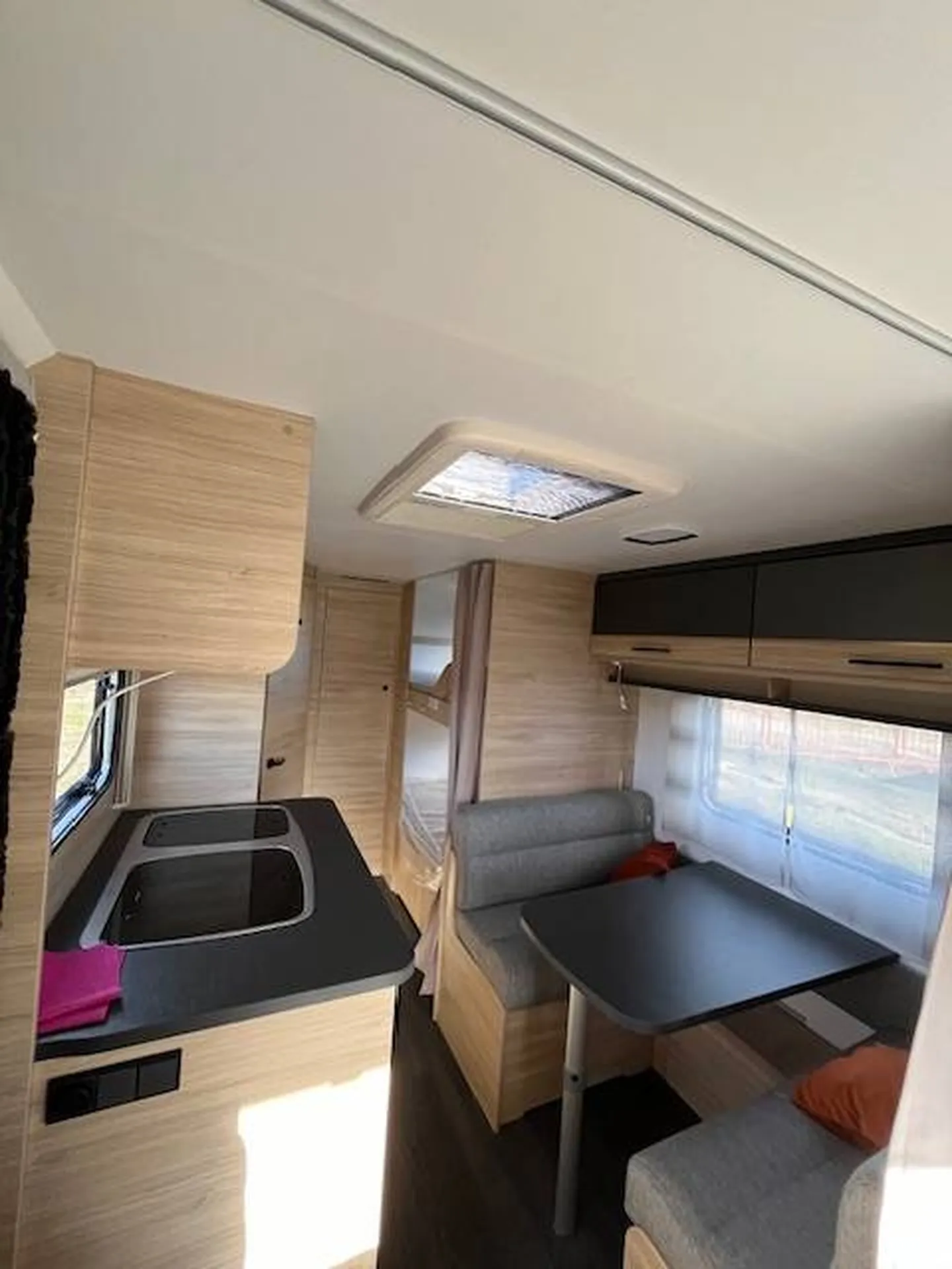 Couchages (7 places) : Un coin-nuit dédié aux enfants avec 3 lits superposés, un grand lit fixe transversal à l'avant pour les parents, et un couchage d'appoint supplémentaire grâce à la dînette transformable (pour 2 personnes).