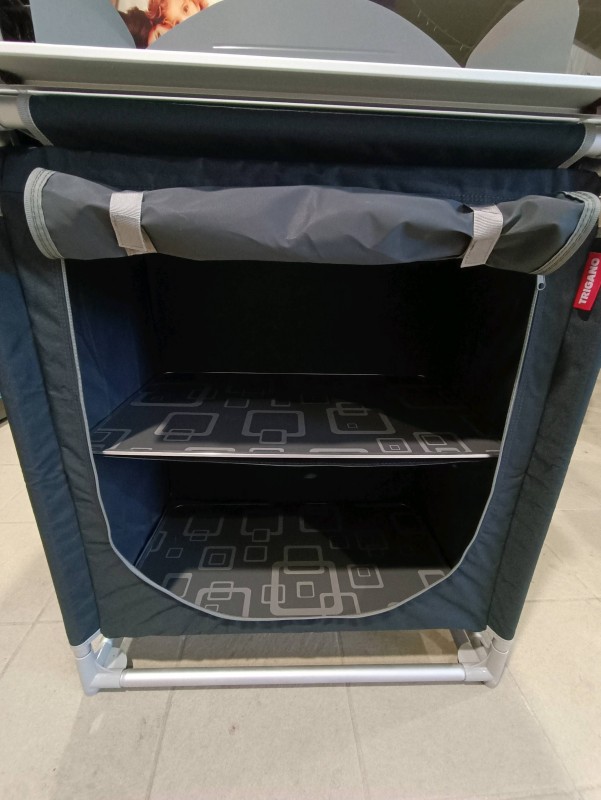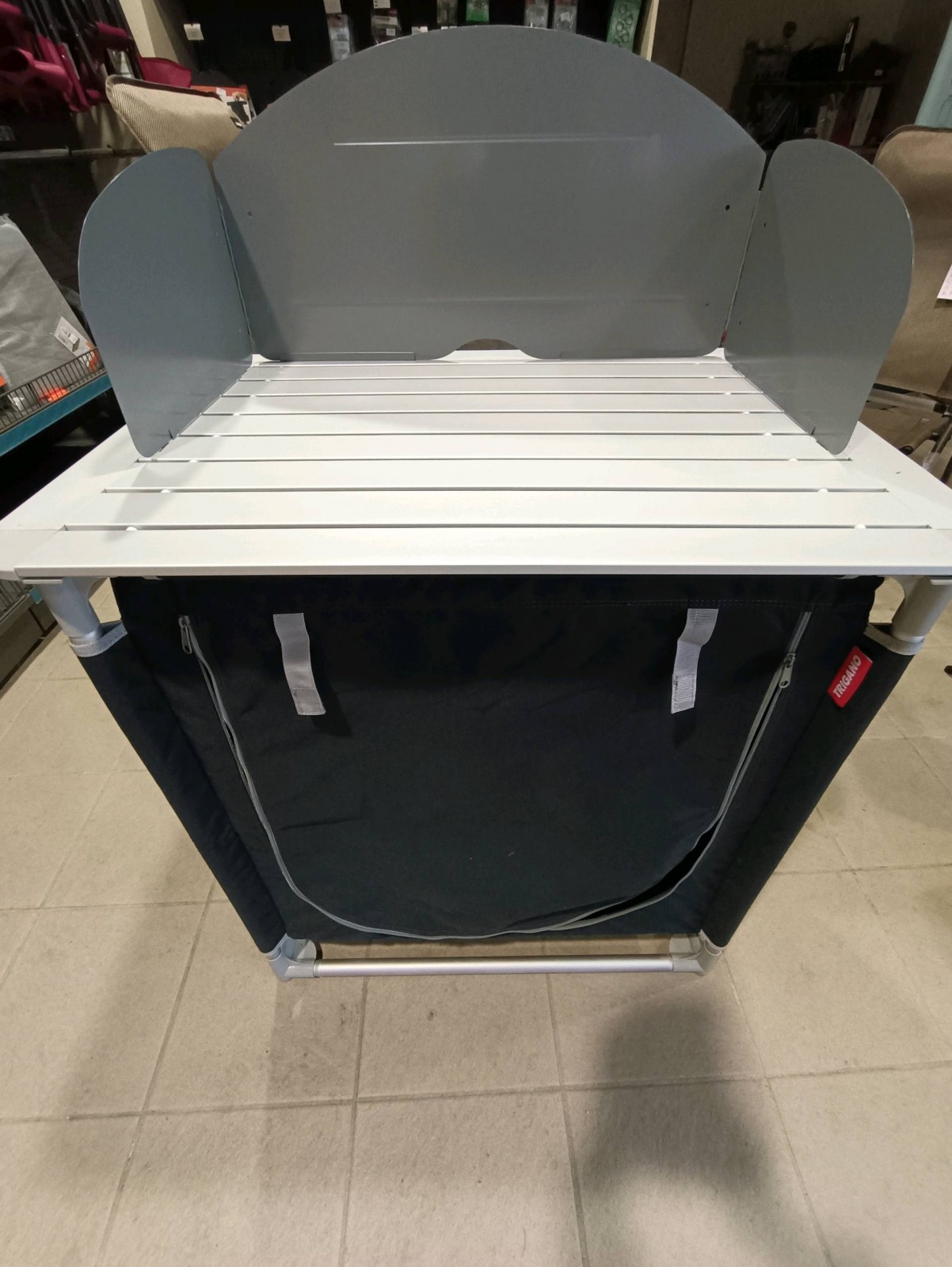 Meuble de cuisine avec pare-feu et 2 étagères avec cerclage aluminium, il possède des poches de rangement sur le côté ainsi que des pieds réglables.