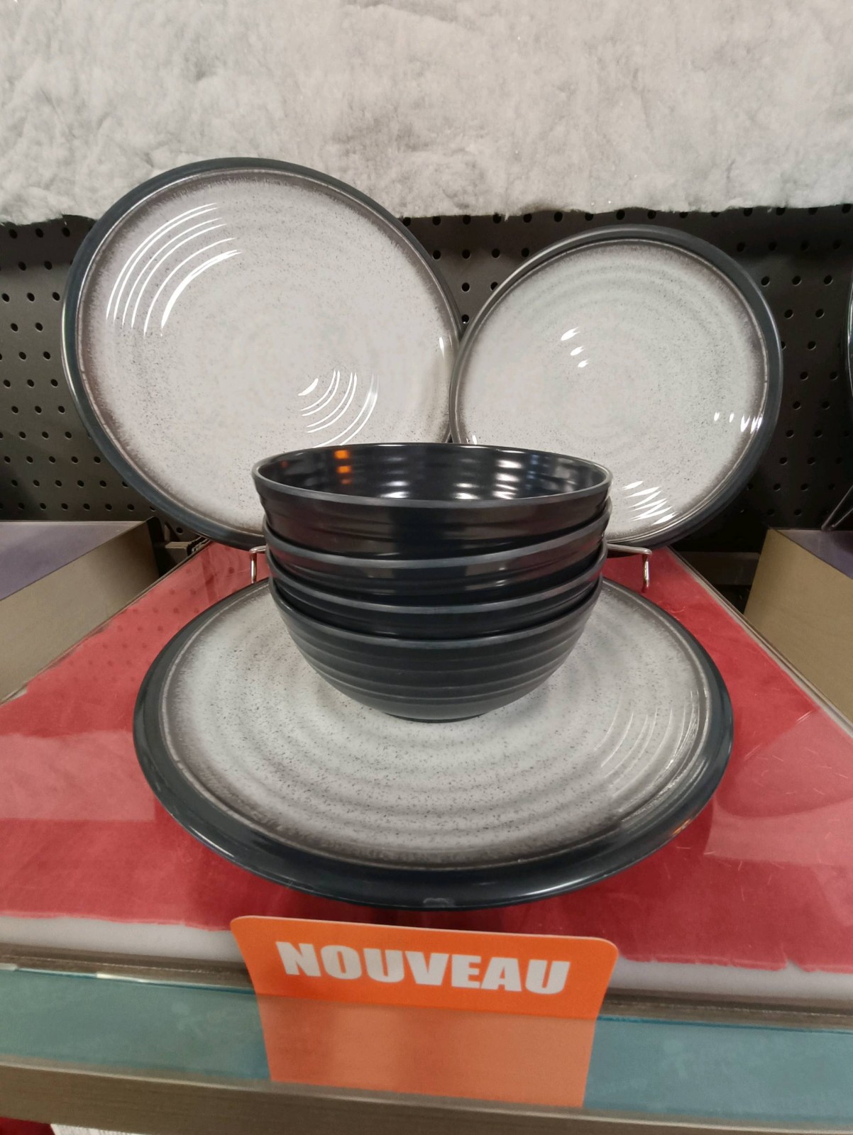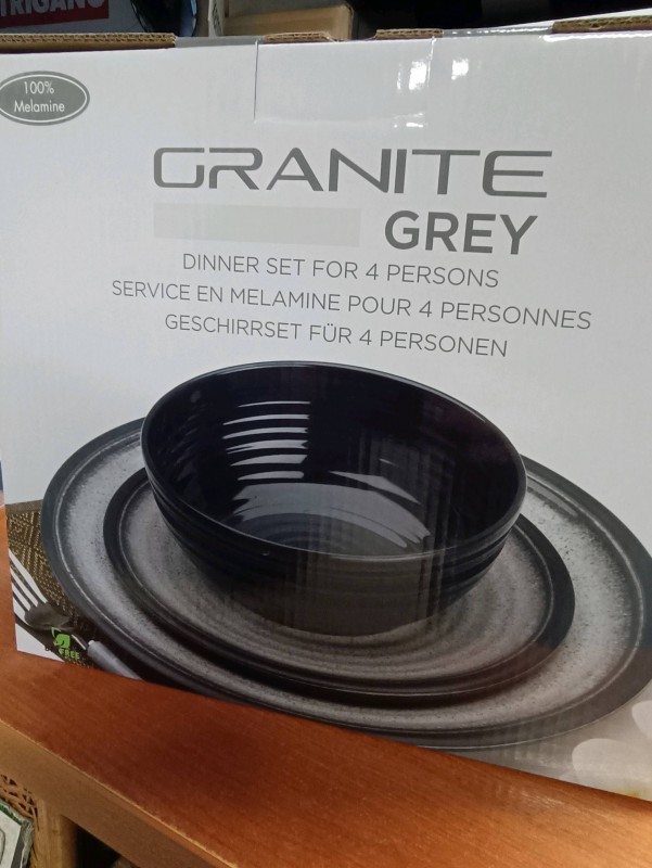 Laissez-vous séduire par ce beau service vaisselle GRANITE GREY 12 pièces pour 4 personnes en 100 % mélamine.