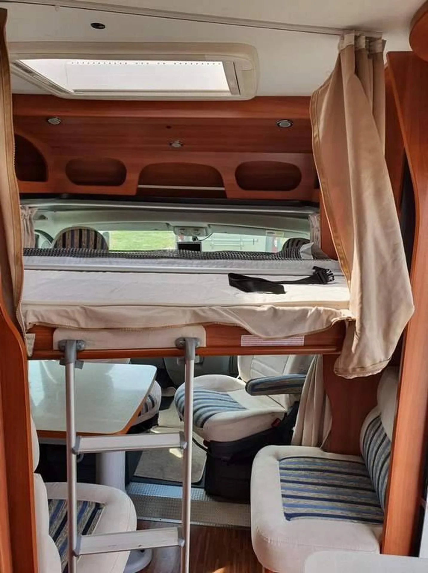 Très beau camping-car de moins de 6M de long, il vous séduira par son nombre de couchage qui est de 4 !! NON vous ne rêvez pas pour un petit véhicule il à tout d'un grand et en parlant de grand il possède une énorme soute dessous le lit !!! Un lit qui mesure 210 X 132 CM. les 2 autres couchages se feront sur le coin dînette pour 1 personne et le lit pavillon électrique pour la seconde personne.