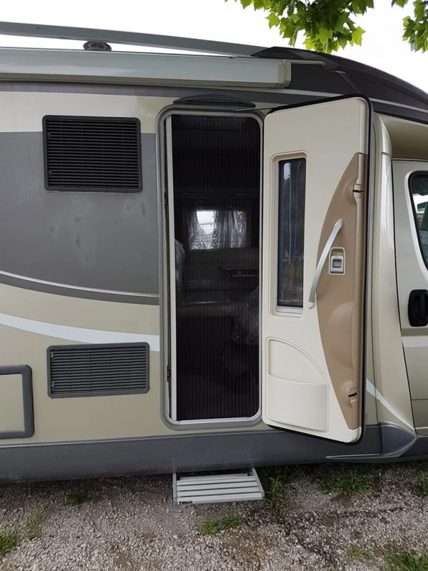 Il a de beaux équipements tel que le store extérieur qui vous fera de l'ombre, le porte vélos, la caméra de recul et son poste GPS, téléphone, radio….., la parabole AUTOMATIQUE + 2 télévisons comma ça il n'y a pas de jaloux, une dans la chambre et une dans le salon !! Sans oublier son panneau solaire qui permettra une meilleure autonomie en chargeant sa batterie AUX.