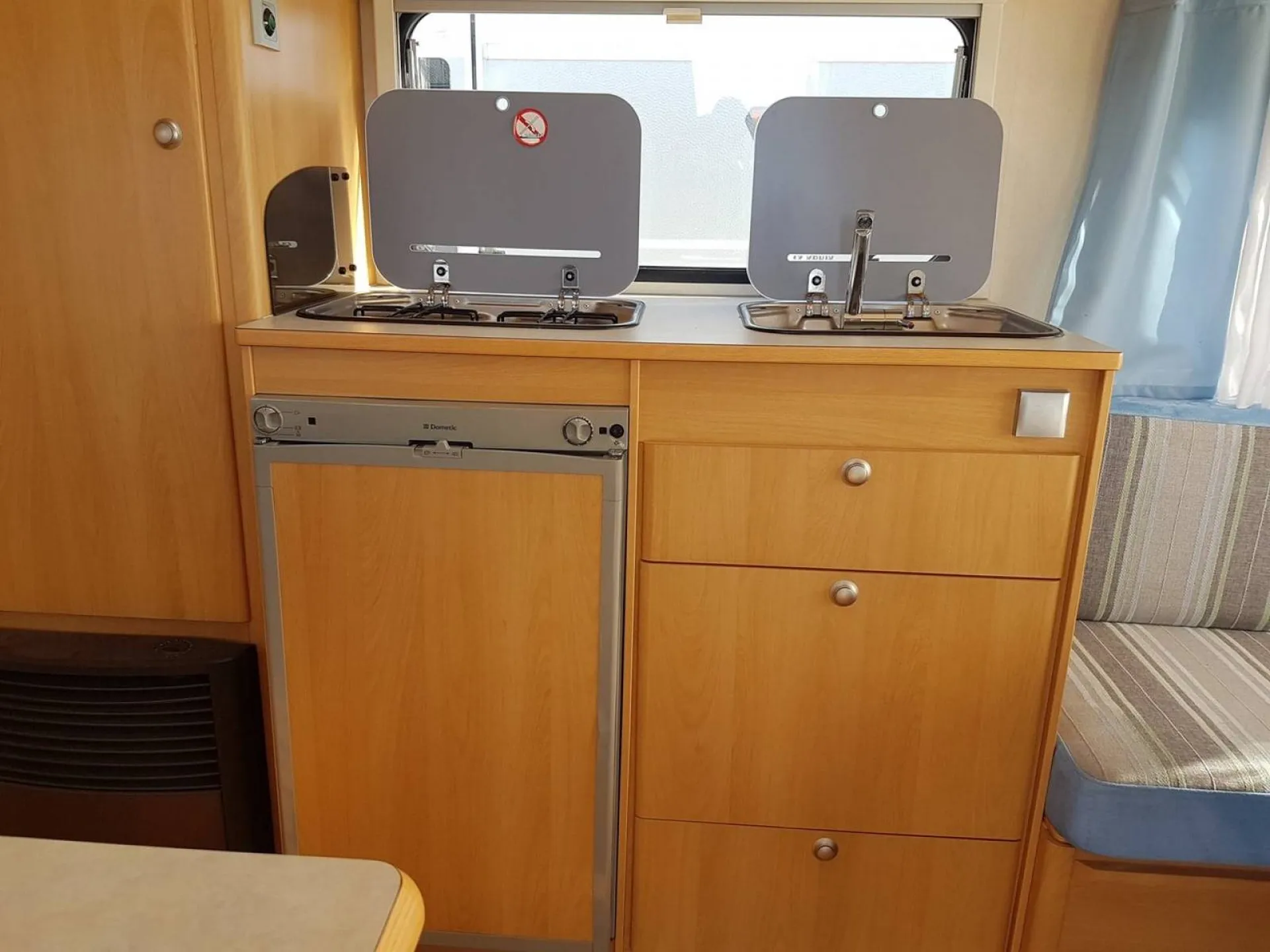 Pour commencer elle possède la climatisation réversible Telair, avec son chauffage au gaz TRUMA, l'antenne omnidirectionnelle sur mât dans la penderie avec sa télévision.Sans oublier son auvent avec une avancée, le stabilisateur AKS 3400 ALKO pour une bonne stabilité sur la route et sur la flèche avant le porte vélos.