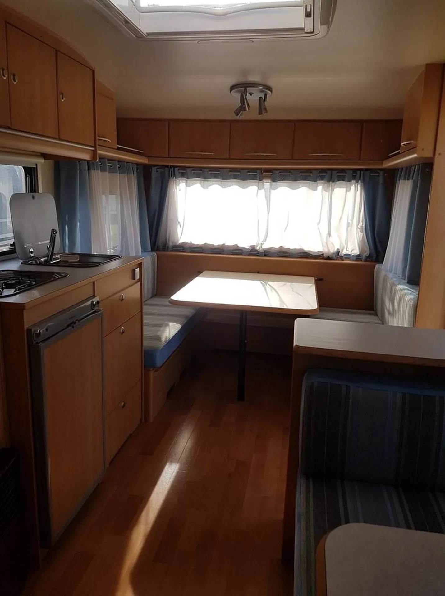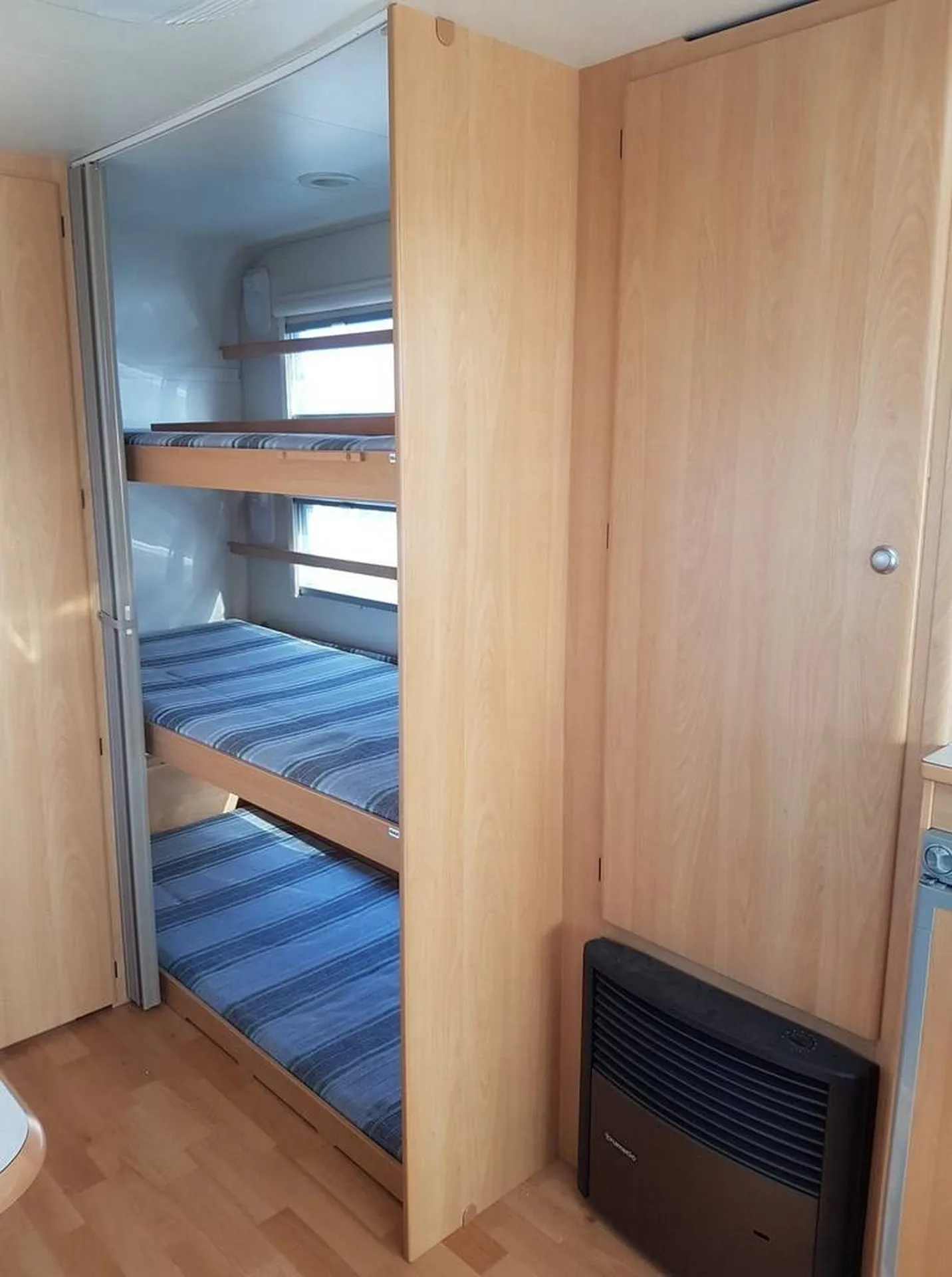 Elle est doter de 6 couchages mais n'a pas de lit fixe, se composant de 3 lits superposés, un coin dînette 2 places transformable en lit pour un adulte ou un enfant et un second coin dînette de 4 places qui se transforme également en lit pour les parents.