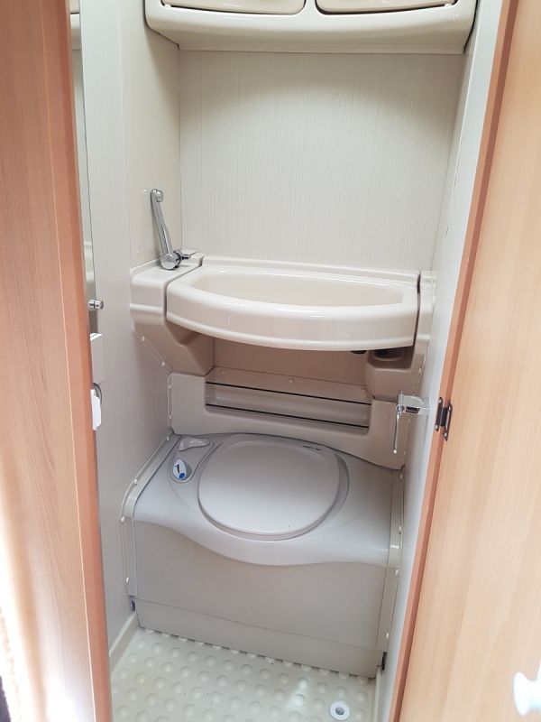 Coin toilette avec wc à cassette et bac de propreté.