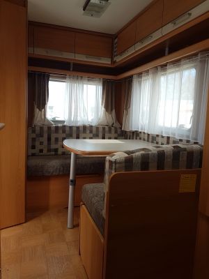 Couchage pour 4 personnes, le lit transversal avec sa soute en dessous et le coin dînette transformable, parfaite pour 2 adultes et 2 enfants.