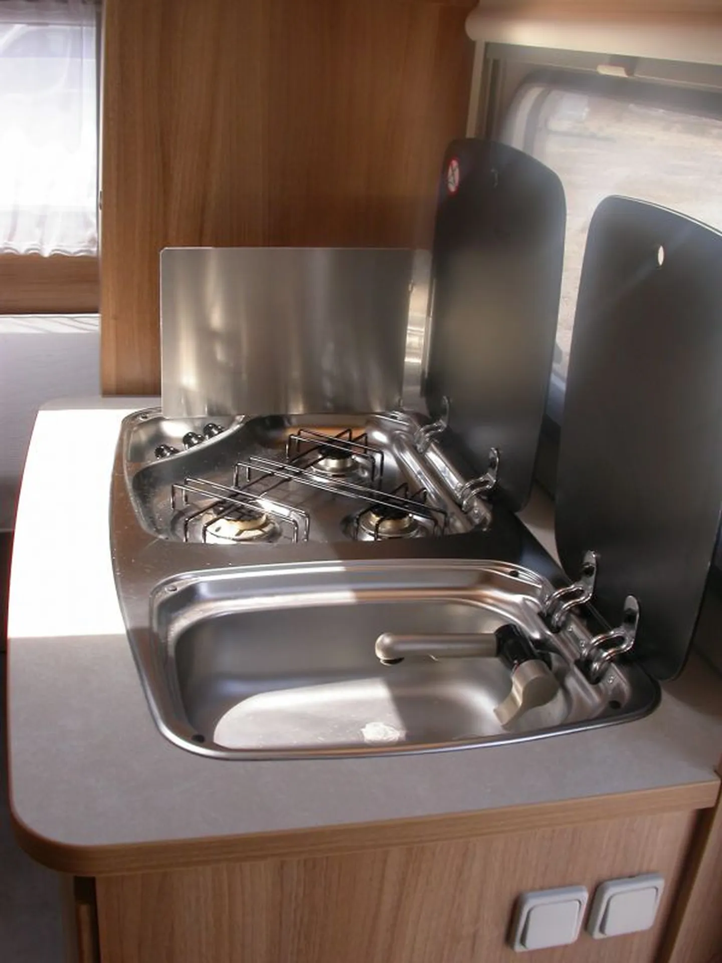 Elle est équipée du chauffe-eau TRUMA therme 5 L, d'un antilacet pour une très bonne stabilité sur la route et d'une roue de secours dans le coffre avant, dans lequel vous retrouverez l'emplacement des deux bouteilles de gaz propane de 13 kgs. Coin toilette avec lavabo relevable et bac de propreté pour se doucher. Réfrigérateur XL FREEZE de 150 L. Combiné réchaud 3 feux, évier avec couvercle en verre.