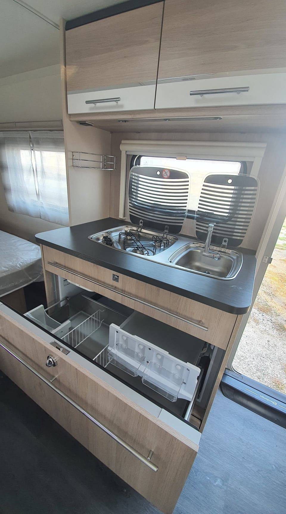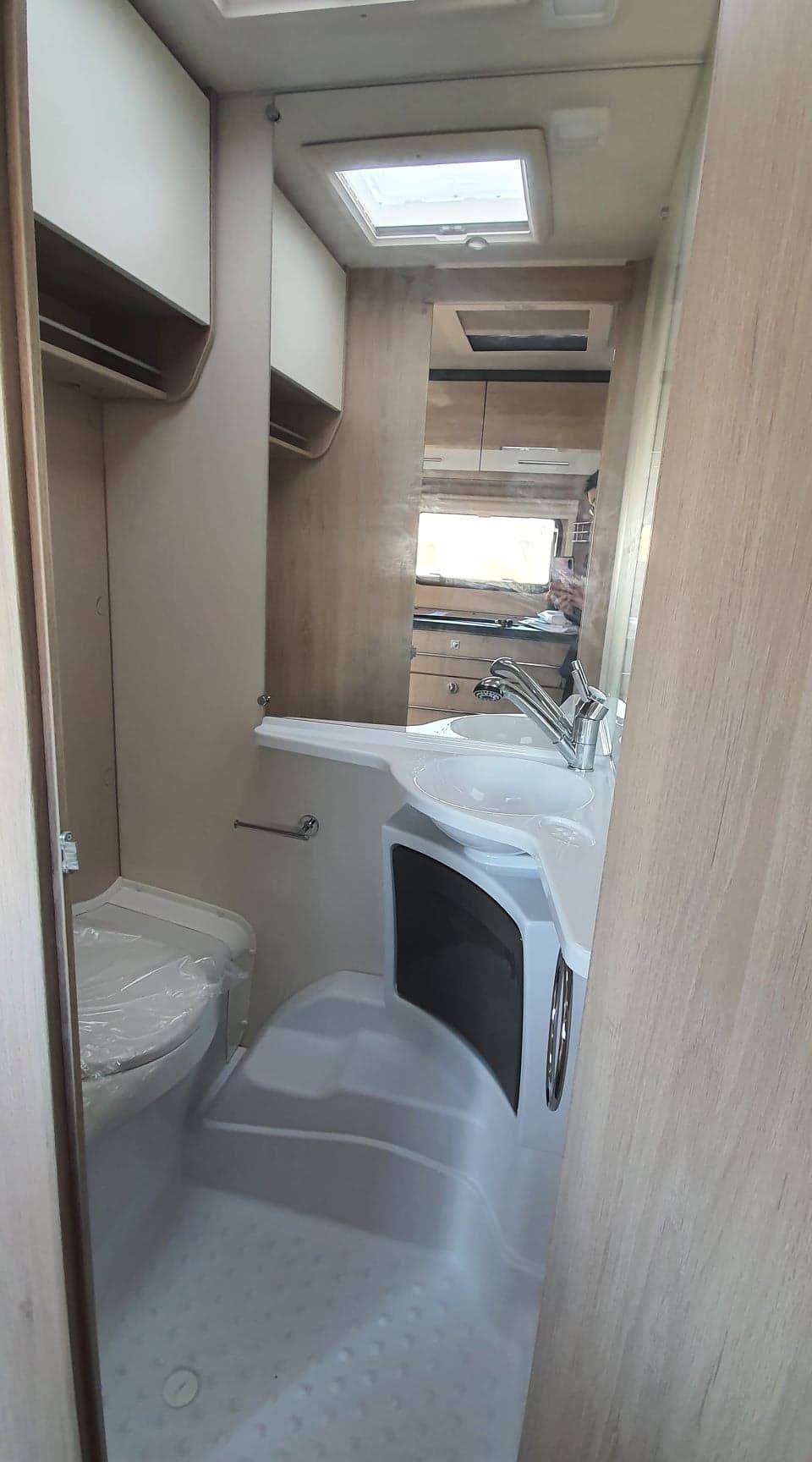 Coin toilette avec bac de propreté et WC à cassette, douche avec chauffe-eau 5 L TRUMA-THERME et douchette sur flexible. Réfrigérateur à tiroir XL FREEZE 150 L à compresseur, un combiné réchaud 3 feux et cuve inox avec couvercle verre. Elle possède une réserve d'eau propre fixe de 50 L.