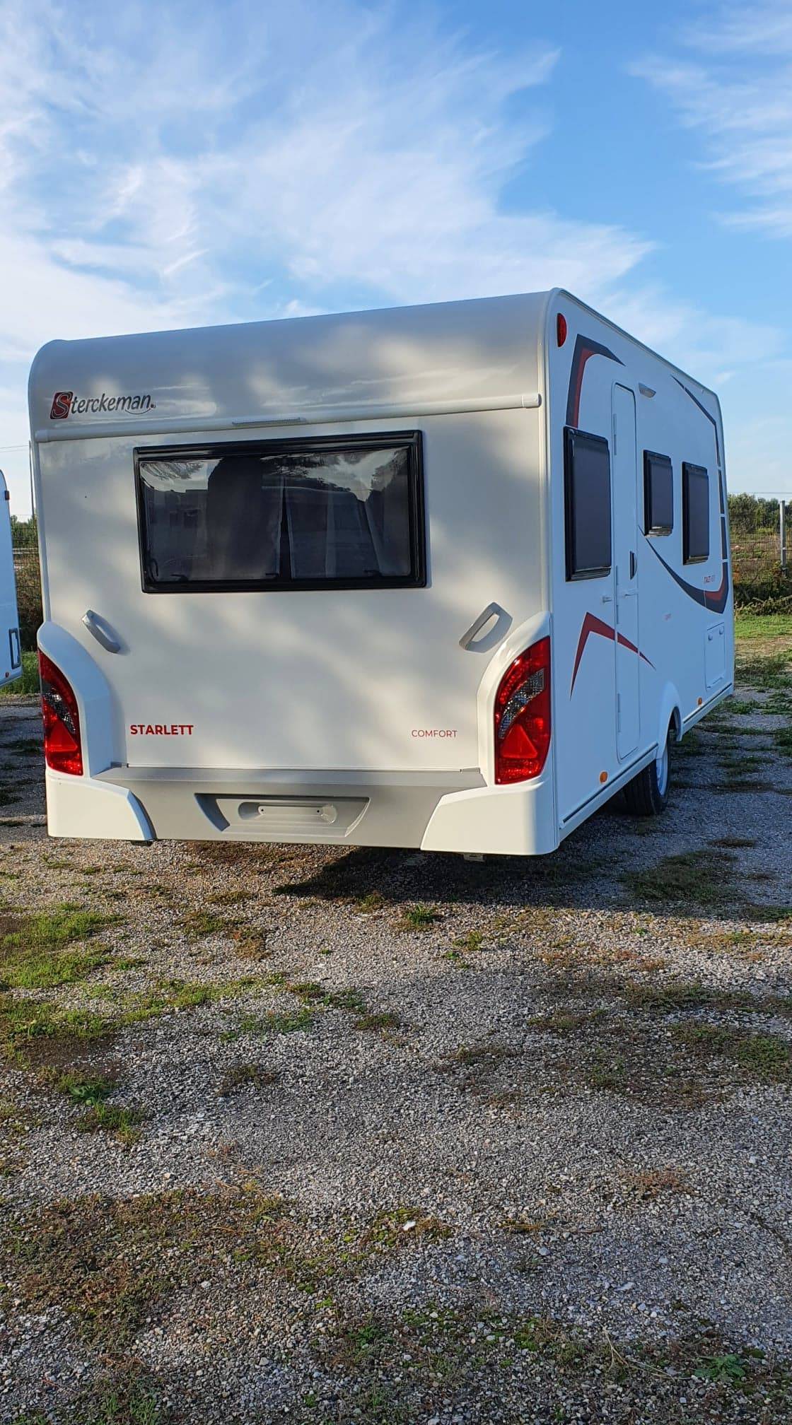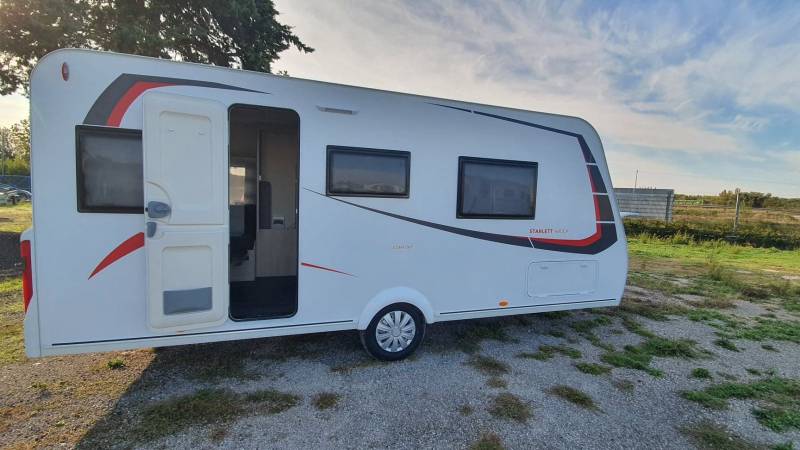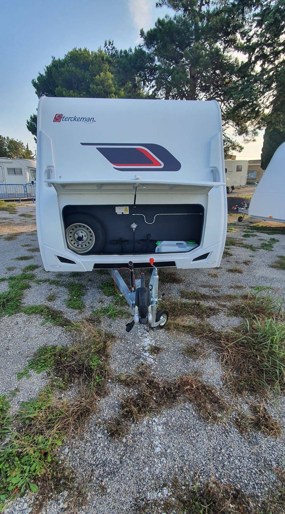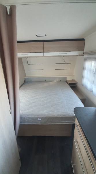 Caravane neuve collection 2021 STERCKEMAN STARLETT COMFORT 480CP tissu HANOI avec lit central (150 X 195) matelas "comfort plus" en coutil ouatiné d'une épaisseur de 15 cm et salon en U transformable en lit d'appoint, c'est une 4 couchages.