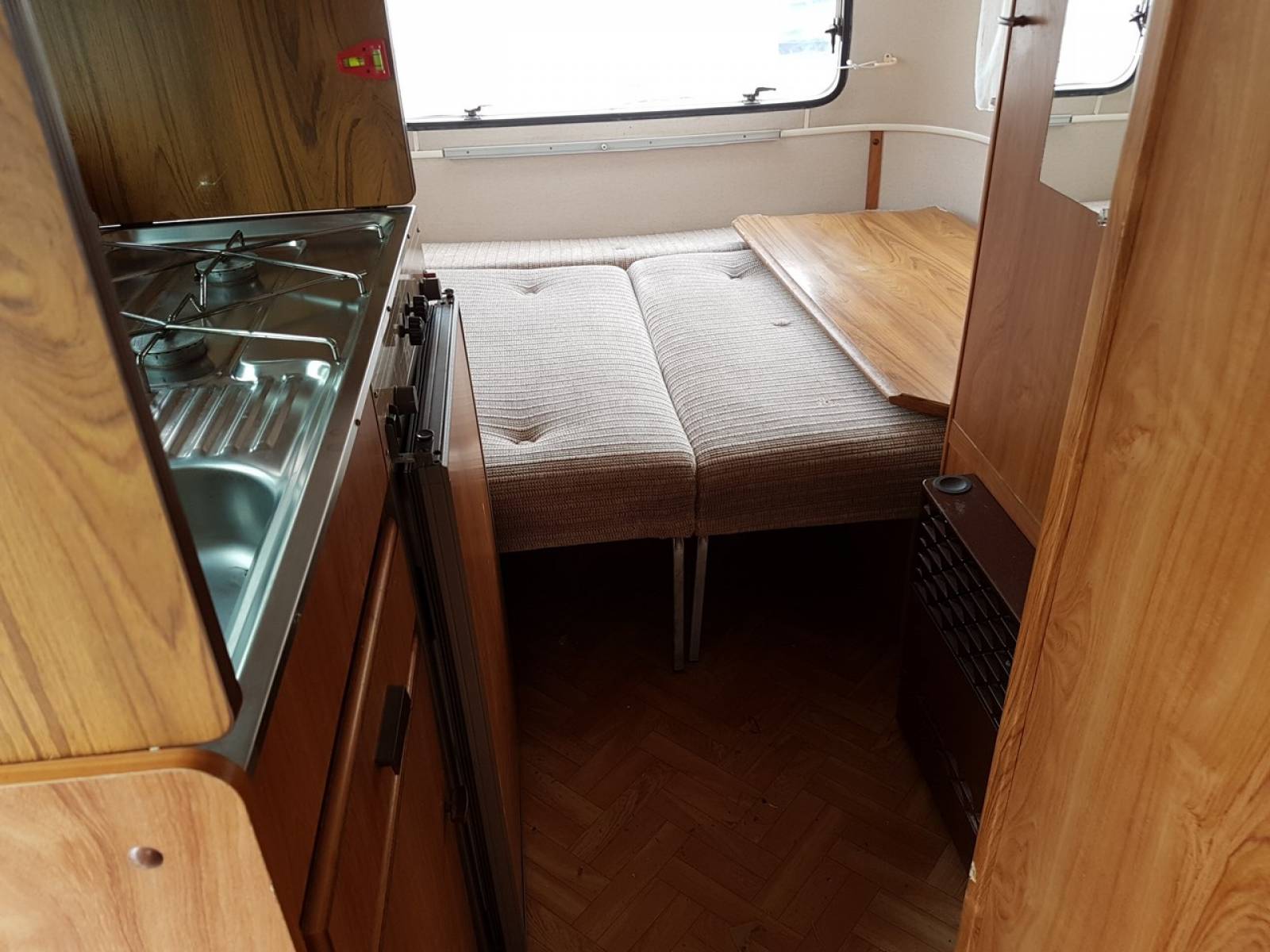 Elle à 2 coins dînette transformable en lit pour 4 personnes. (pas de lit fixe).