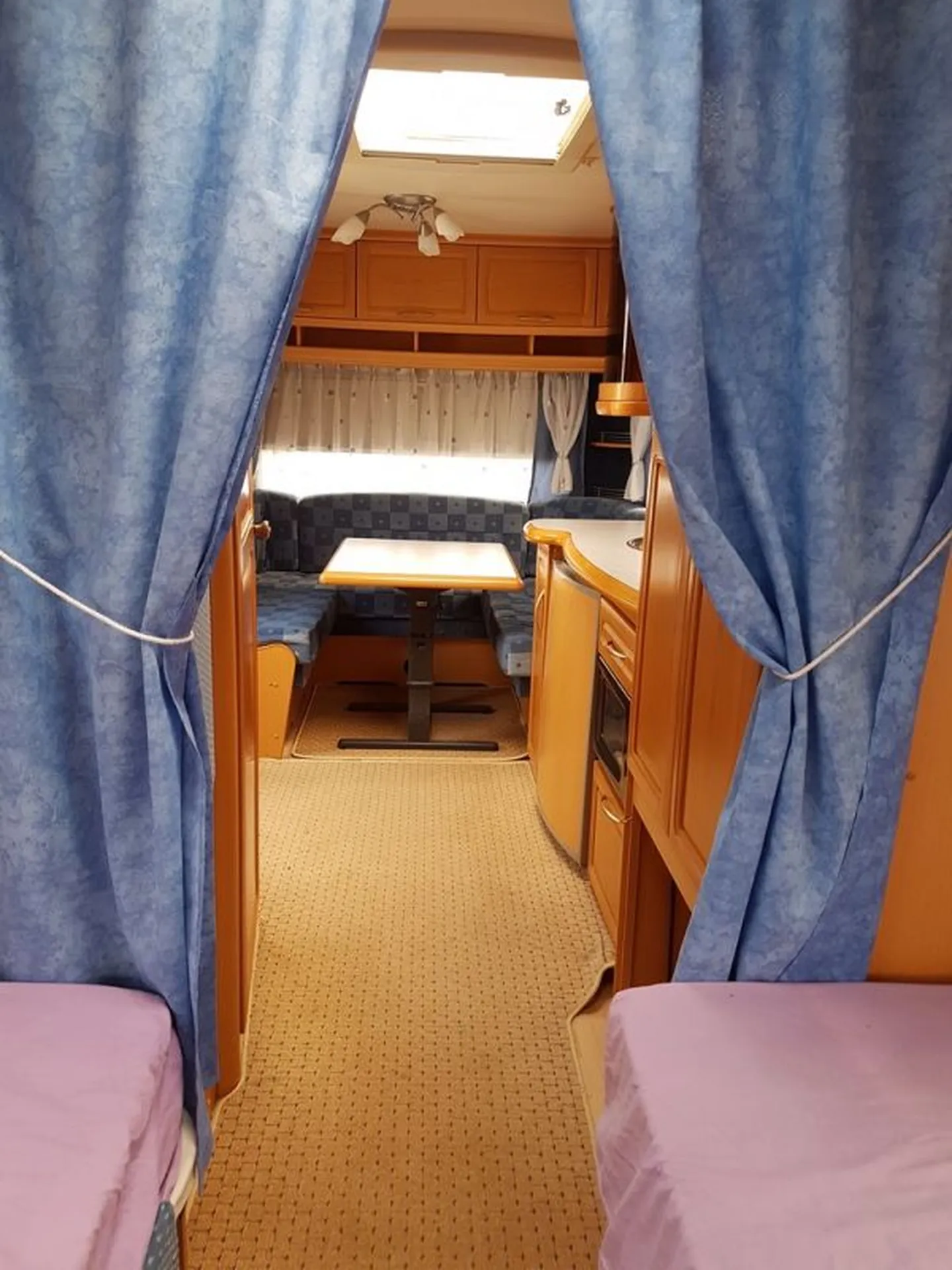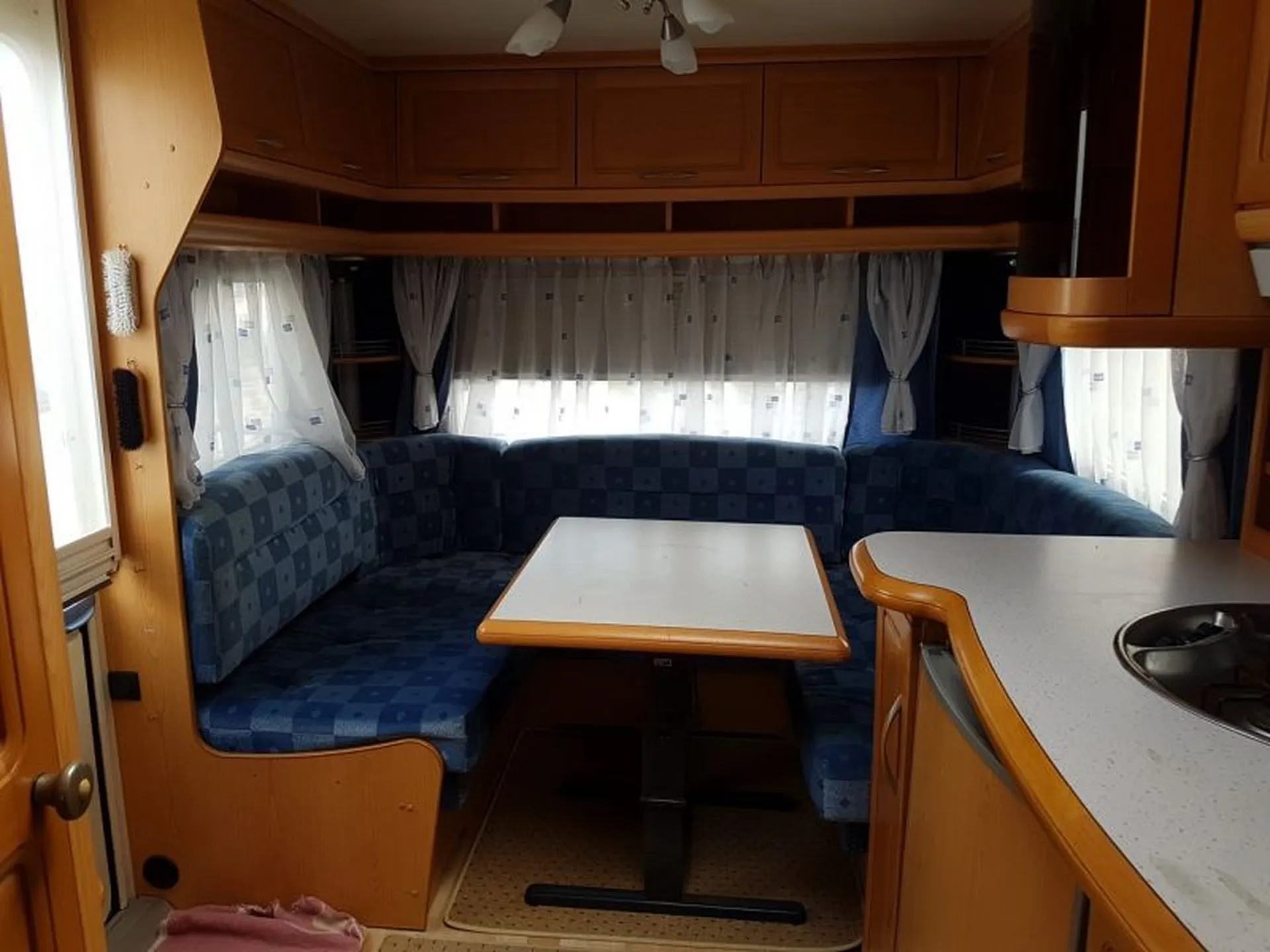 Belle caravane HOBBY Prestige 540 de plus de 5 M de long avec 4 couchages, lits jumeaux et coin salon en U permettant le second couchage d'appoint de 2 personnes généralement des enfants.