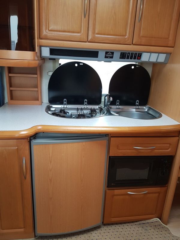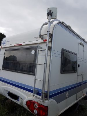 Elle a également un auvent, un déplace caravane bien pratique selon le terrain pour la garer plus facilement, d'une antenne hertzienne sur mât dans la penderie et d'un micro-ondes, idéale pour aller dans les campings. Possède aussi une échelle de toit pour un accès plus facile si vous voulez la laver.