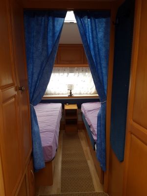 Belle caravane HOBBY Prestige 540 de plus de 5 M de long avec 4 couchages, lits jumeaux et coin salon en U permettant le second couchage d'appoint de 2 personnes généralement des enfants.