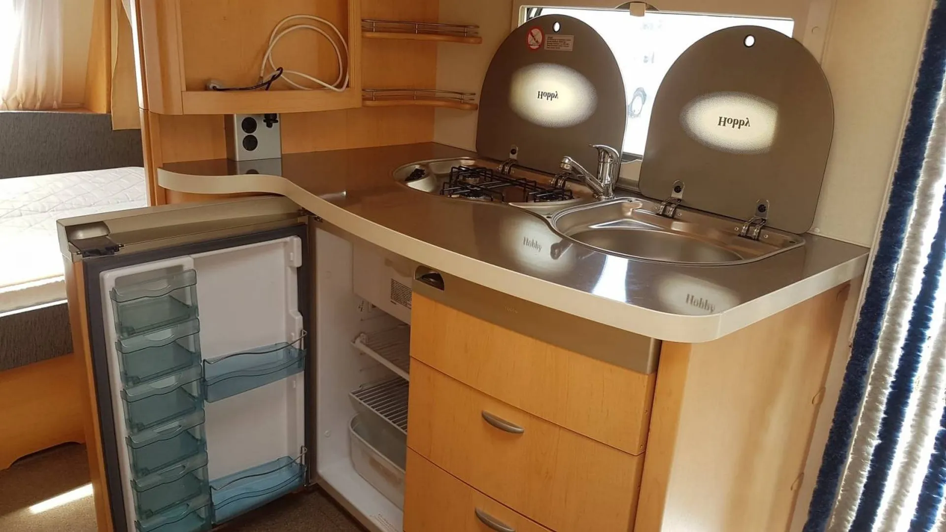 Caravane Hobby de luxe 495 UL de 4 couchages avec un lit central transversal et lit dînette du salon en U.