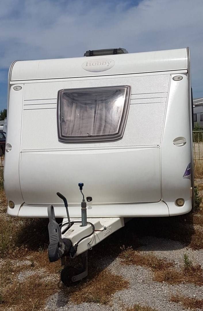 Caravane Hobby de luxe 495 UL de 4 couchages avec un lit central transversal et lit dînette du salon en U.