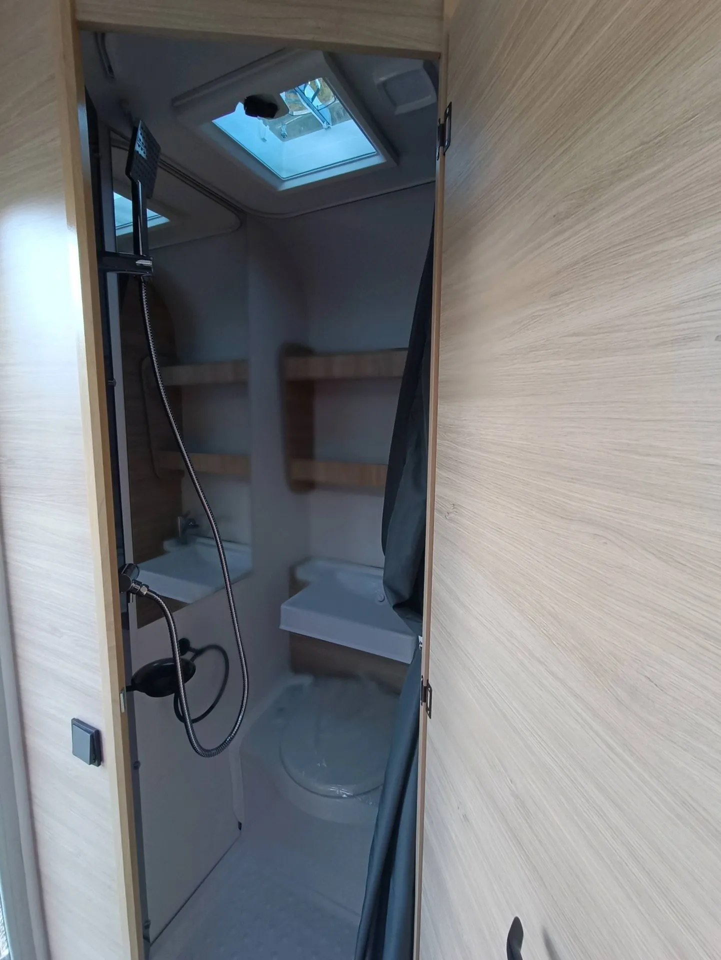 Les parois latérales en polyester, un anti-lacets AKS 3004, les amortisseurs, un portillon extérieur latéral (100 x 40 cm), chauffe-eau trumatherme 5 L, la douchette sur flexible, le réservoir d'eau usée 30 L (à roulettes), le réservoir d'eau propre 50 litres (fixe) un lanterneau panoramique (70 x 50 cm) l'ambiance tissu Sydney, le matelas épaisseur 15 cm, le rideau de douche et le support de roue de secours coffre avant.