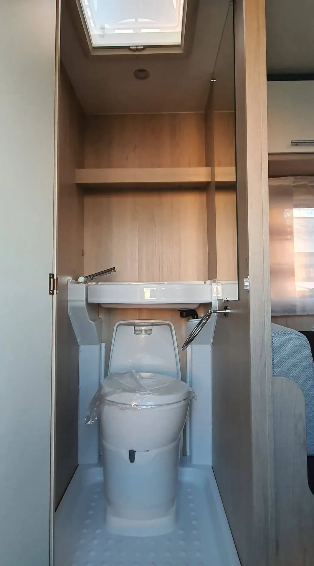 Coin toilette avec WC à cassette manuel et bac de propreté, lavabo relevable.